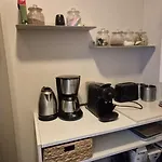 Geniet van een ingerichte kitchenette in het appartement met een koffie/theezetapparaat, een koelkast en keukengerei voor uw gemak.